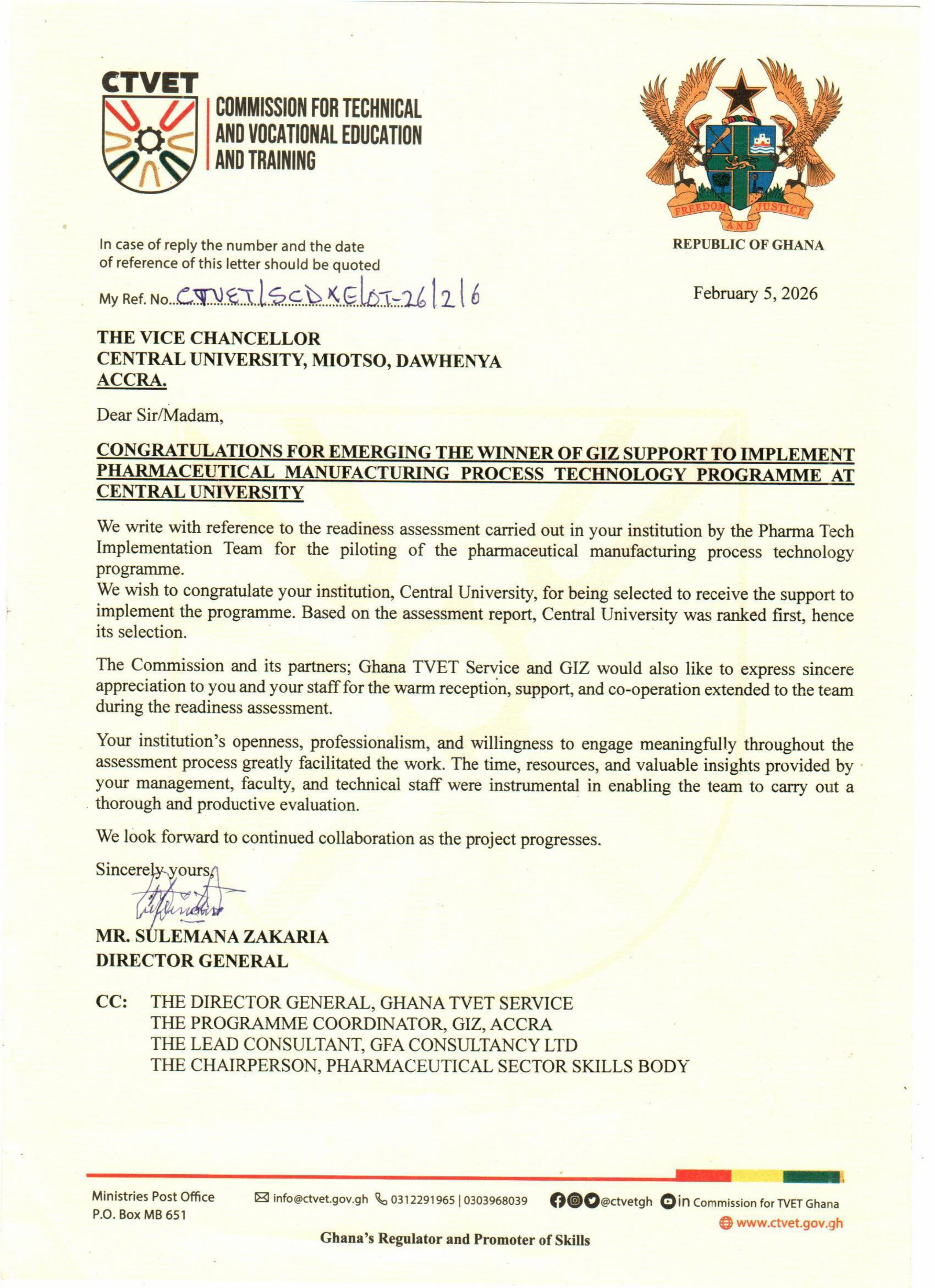 In an official communication dated February 5, 2026, the Commission for Technical and Vocational Education and Training (CTVET) congratulated the University on its outstanding performance, noting that Central University emerged top among assessed institutions and was therefore selected to benefit from the programme’s implementation support.